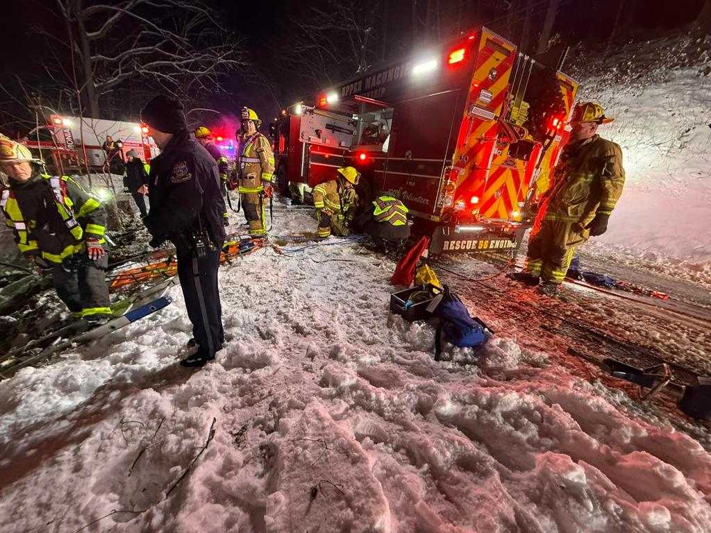 Firefighters then utilized a rope haul system, known as a “Z-rig,” to carefully raise the patient up the embankment and transfer them safely to awaiting EMS personnel. Rescue efforts were complicated by the patient’s weight and fresh snow, which created challenging footing and operating conditions. Despite these obstacles, crews worked efficiently and professionally to complete the rescue without further injury.